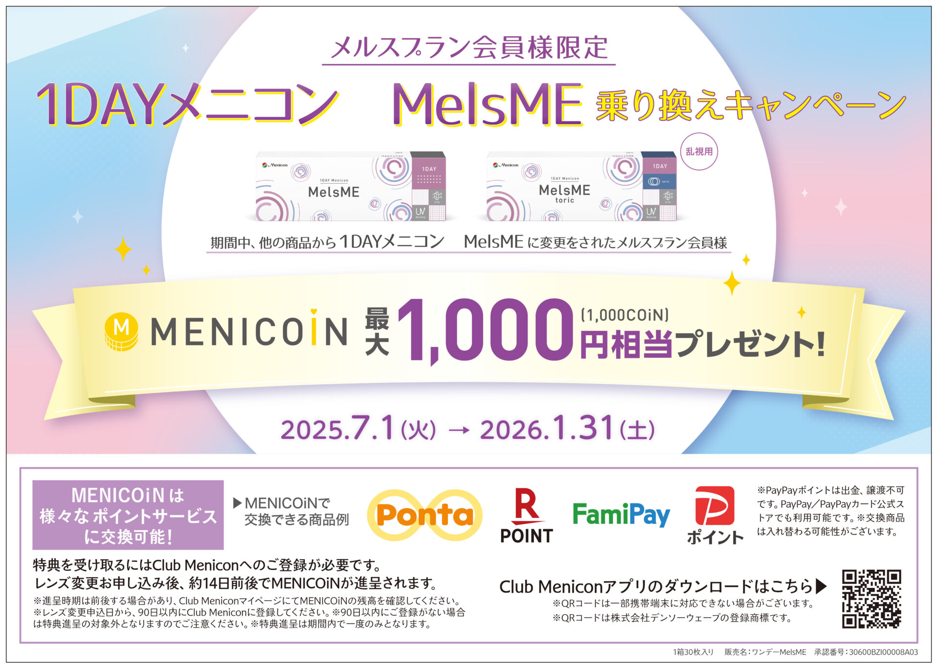 期間中【2026年1月31日(土)まで】、他のレンズから『1DAYメルスミー』へ乗り換え(種類変更)されたメルスプラン会員様へ1000円相当のポイントをプレゼント!